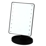 The mirror can be powered by four AA batteries (not included), making it an exceptionally practical tool for everyday use, travel, or places without an outlet. The wide, stable base features a practical organizer, ideal for small cosmetic products, jewelry, or brushes. The modern design, black finish, and intuitive controls combine aesthetics with functionality.