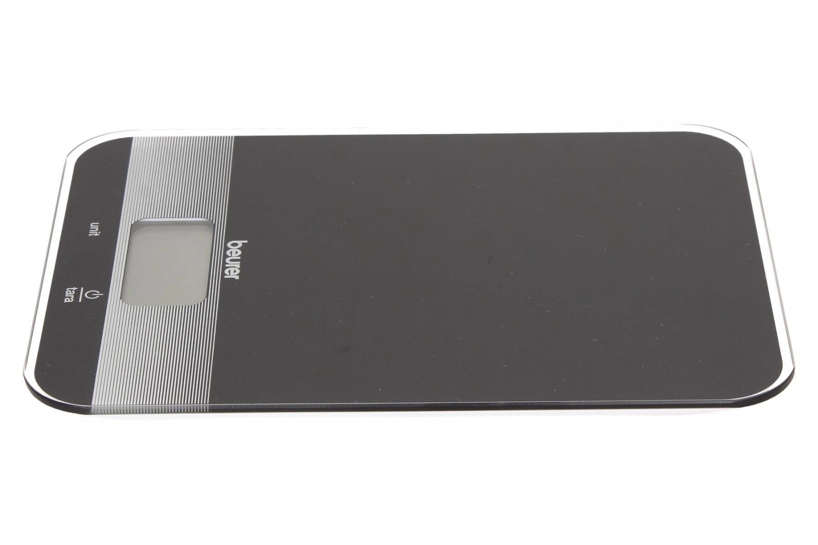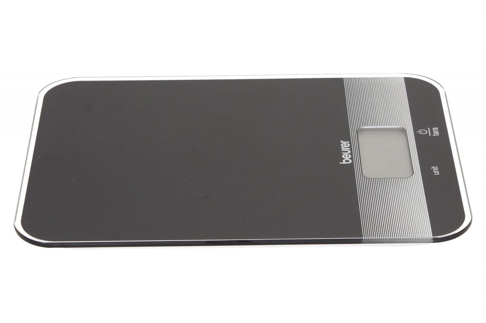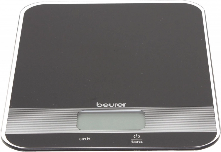 Beurer kitchen scale in elegant black color is equipped with a practical tare function and an easy-to-read LCD display. The glass surface provides a modern look and easy cleaning.