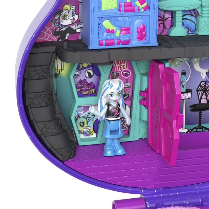 Discover frightfully fun mini-sized adventures with the Polly Pocket x MONSTER HIGH compact. The stylish purple skull with a glittery bow opens into a two-level school and skatepark packed with play features, accessories, and mini figures of Draculaura, Clawdeen Wolf, and Frankie Stein for endless on-the-go stories.