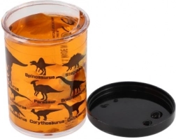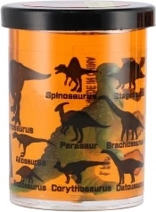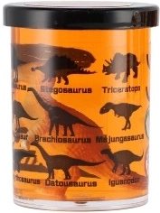 The cup is decorated with dinosaur silhouettes and names (e.g., Stegosaurus, Triceratops, Spinosaurus), encouraging learning through play. Perfect as a small gift, reward, or party favor.