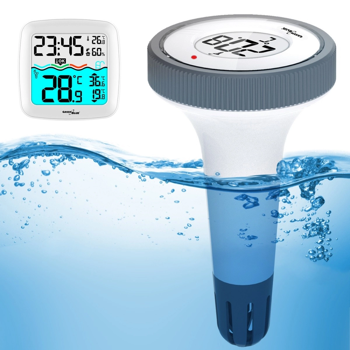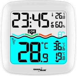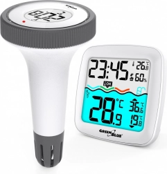 A practical home weather station with a wireless pool thermometer offering a range up to 60 m, a large, easy-to-read color display, and clear visualization of water temperature, air temperature and humidity, time, and calendar. Reliable quality from GREENBLUE.