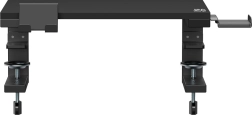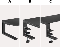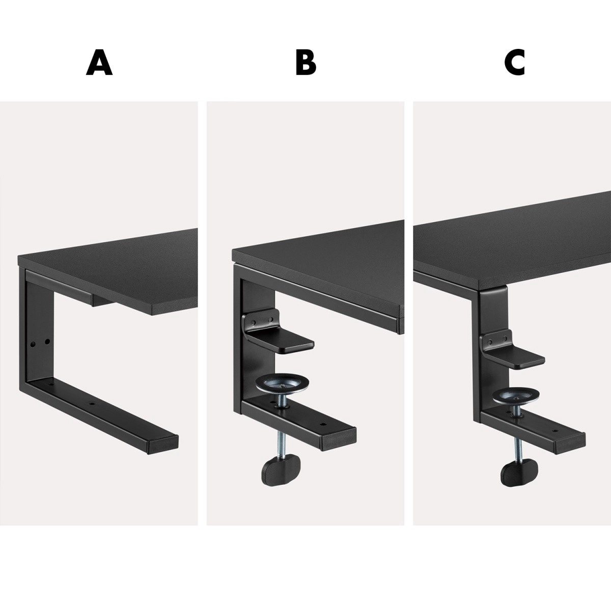 Installation is quick and furniture-safe — the pair of adjustable clamps fastens firmly to the desktop (max thickness approx. 50 mm), while the rubber pads protect the surface from scratches. The robust construction provides high stability even for heavier devices up to 20 kg.