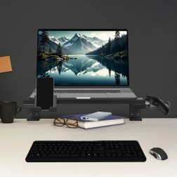 The practical ER-303 B desk riser improves workspace organization by lifting your laptop or monitor to an ergonomic height. Thanks to its metal construction it supports up to 20 kg, is compatible with 13–32" screens, and mounts securely using screw-on desk clamps with no drilling. Its stable design, desk surface protection, and space-saving benefits make it an ideal choice for both office and gaming setups.