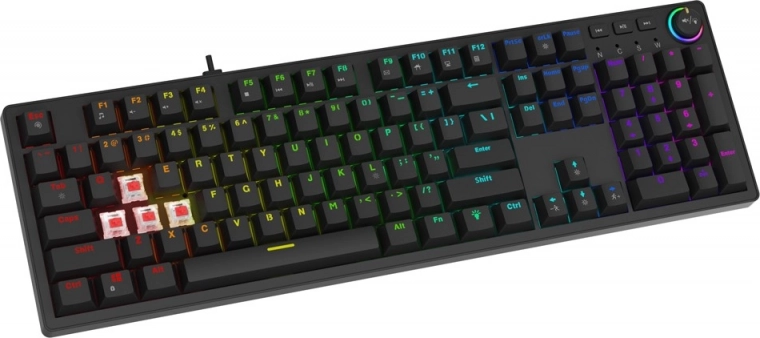The full-size layout with a numeric keypad and multimedia keys delivers maximum functionality for work and play. A practical multifunction knob makes it easy to quickly adjust volume and backlight brightness without complex shortcuts. Durable ABS keycaps, a braided USB-A/USB-C cable, and included tools for removing keycaps and switches round out the thoughtful package.