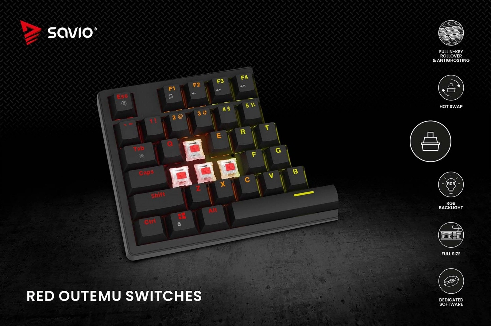 The full-size Savio STYX mechanical keyboard combines everyday typing comfort with gaming performance. Linear OUTEMU RED switches with low actuation force and quiet operation ensure rapid reactions and smooth typing — ideal for competitive play and long documents alike. With a lifespan of up to 50 million presses, it’s built for demanding use.