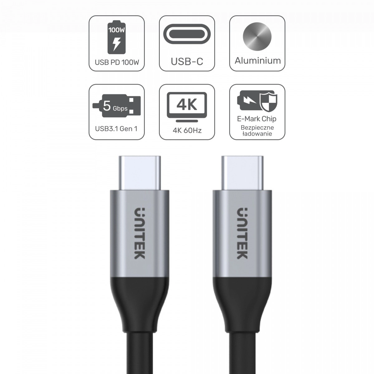 Universal USB‑C ↔ USB‑C cable, 2 m long, for fast transfer of data, video, and power. Offers up to 100 W Power Delivery, data transfer at 5 Gbps (USB 3.1 Gen 1), and video up to 4K at 60 Hz. Thanks to the E‑MARK chip and aluminum connectors, the connection is fast, stable, and safe.