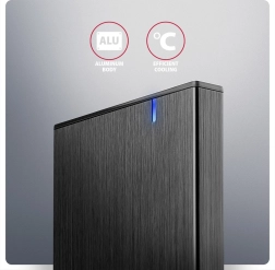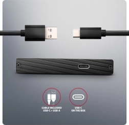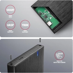 Compact and durable aluminum external AXAGON enclosure for 2.5" SSD/HDD offers USB‑C 3.2 Gen 1 with speeds up to 5 Gbps, UASP support for higher SSD performance, TRIM, S.M.A.R.T., and reliable cooling thanks to the aluminum body with a brushed finish.