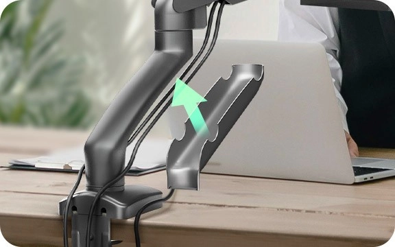 Practical integrated cable management routes cables under the arm, reducing clutter and tripping hazards. The mount offers dual mounting options—a desk edge clamp and a grommet mount—for secure, versatile installation on most desktops. Compatibility with VESA 75×75 and 100×100 ensures quick installation for most common monitors.