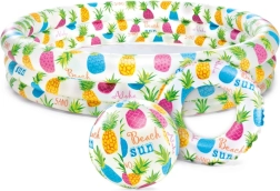 The children’s inflatable pool with a cheerful tropical/fruit print creates a safe and fun place for summer refreshment. Three separate air chambers ensure stability and comfort, while the package also includes a swim ring and an inflatable ball for even more playtime.