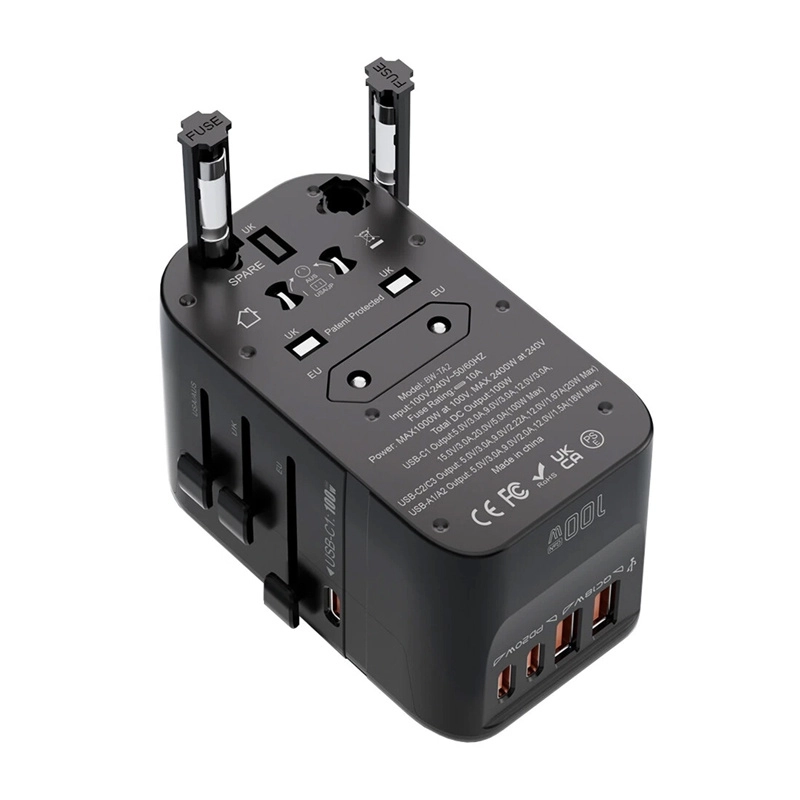 The compact BLITZWOLF BW-TA2 travel adapter combines international compatibility (EU/UK/US/AUS) with 100W GaN fast charging. It offers 5 ports for powering multiple devices simultaneously, including USB-C PD up to 100 W for laptops and USB-A/USB-C with QC/PD for phones and accessories. Thanks to the multi-standard socket, sliding plugs, and a 10A fuse, it’s the ideal companion for any trip.