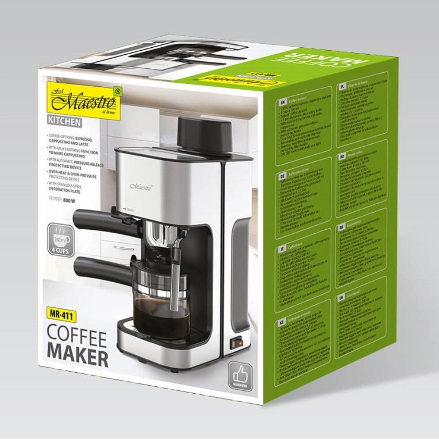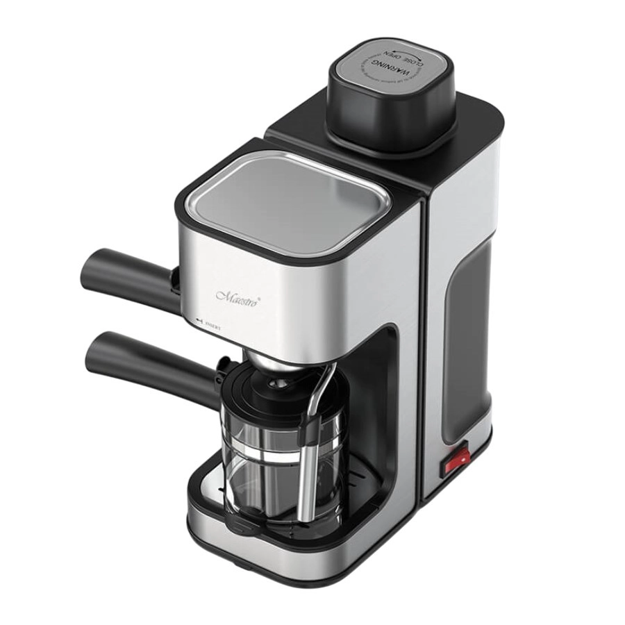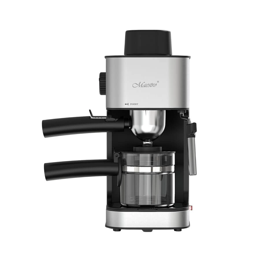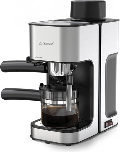 Enjoy café-style coffee at home with the compact Maestro lever espresso machine. It prepares espresso, cappuccino, and latte from ground coffee, features a steam wand for milk frothing, a warmed cup tray, and a practical glass carafe up to 240 ml. With 3.5 bar pressure and 800 W power, you’ll get aromatic coffee with rich flavor every day.