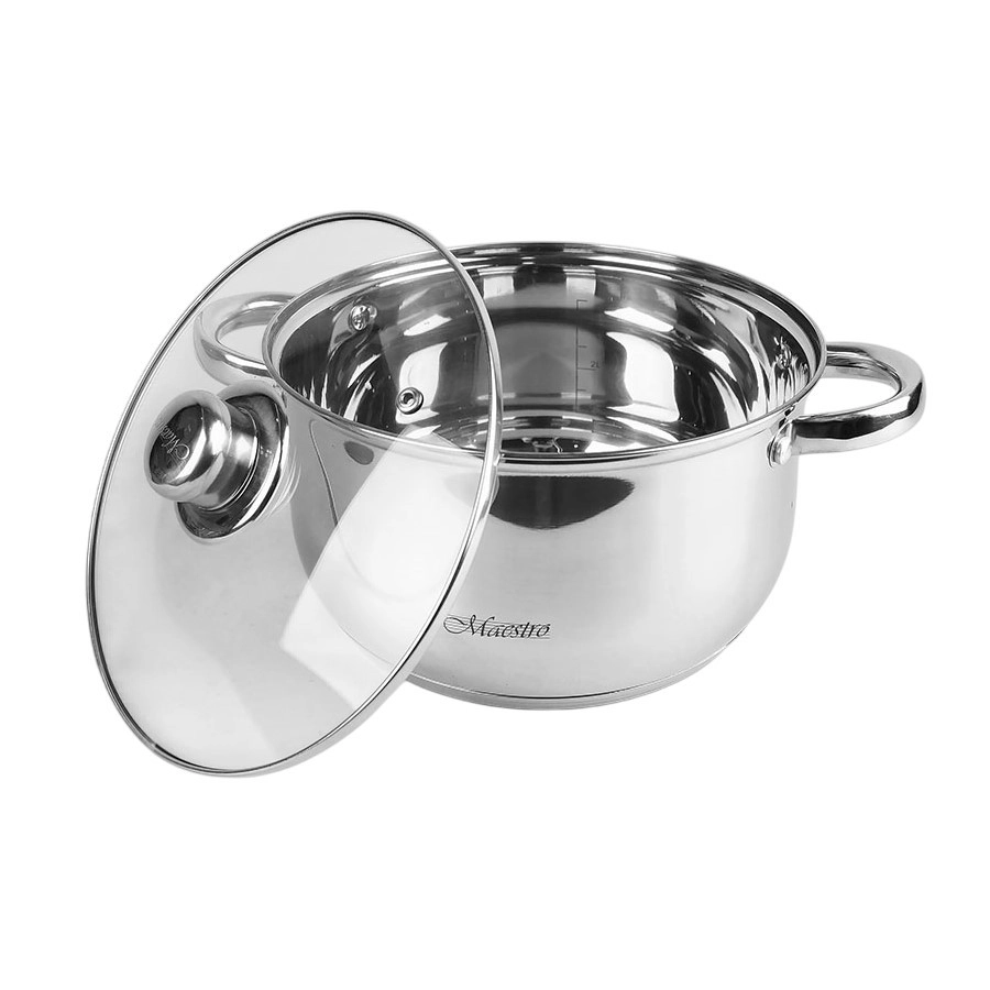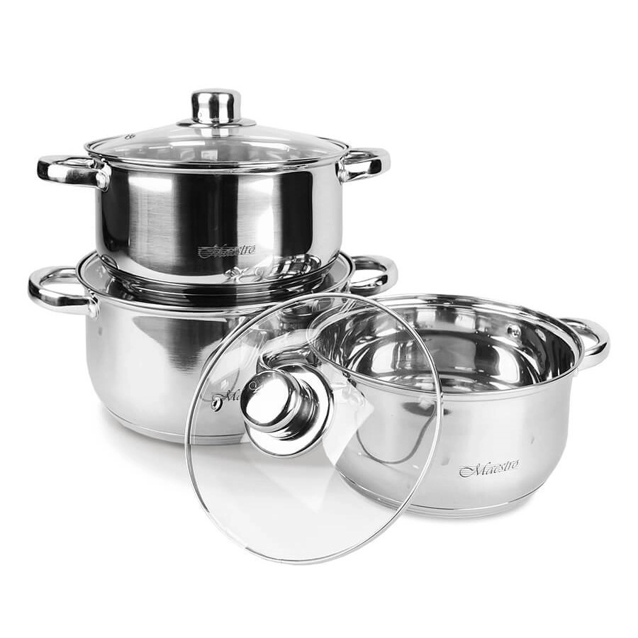 With the Maestro 6-piece pot set, you get reliable cookware for everyday use. Pots made of durable stainless steel are easy to maintain, glass lids with a steam-release opening allow you to monitor cooking, and the multi-layer thermo-accumulating base saves energy thanks to even heat distribution.