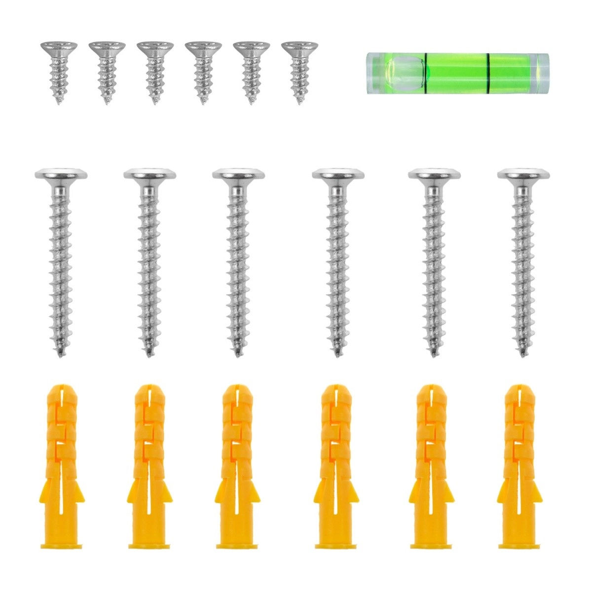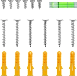 The set includes mounting hardware with screws, wall plugs, and a mini spirit level for precise and quick wall installation.