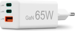 The compact Hama wall charger with GaN technology and 65 W output quickly charges your phone, tablet, and laptop. It supports Power Delivery and Quick Charge, and offers 2× USB‑C + 1× USB‑A for simultaneous charging of three devices. It provides safe charging, smart current management, and up to 60% in 30 minutes on compatible phones.