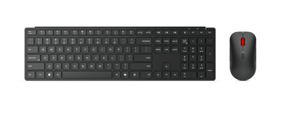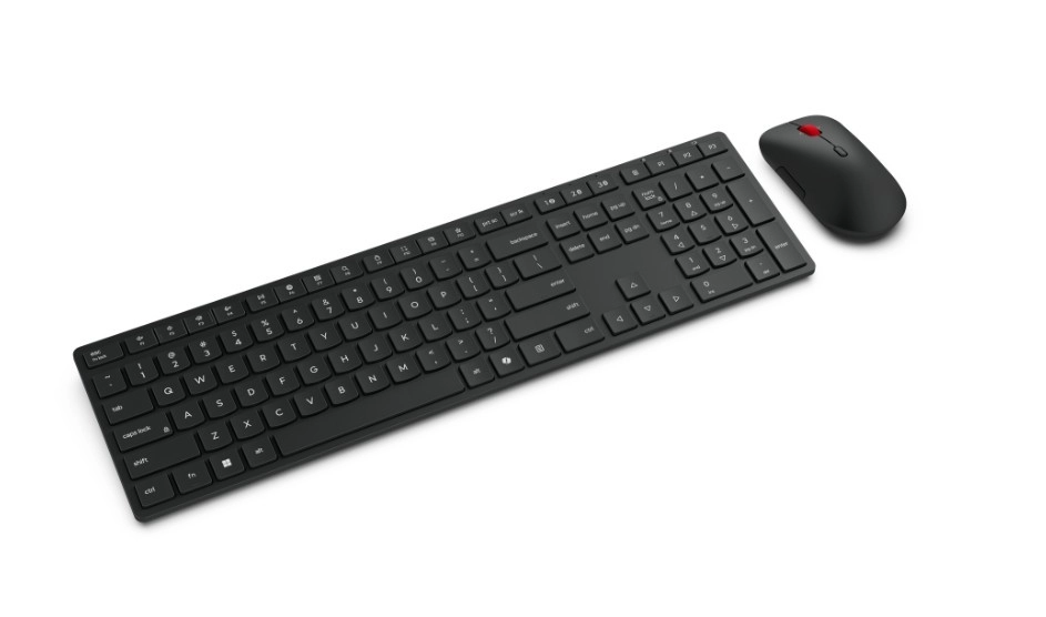 Low-profile keys and quiet switches reduce office noise. The ambidextrous mouse with silent click provides all-day ergonomic comfort.