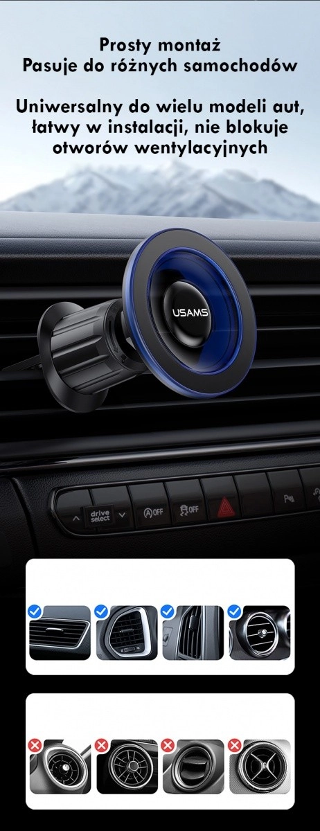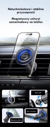 The USAMS ZJ081 combines durable materials (acrylic and silicone) with thoughtful ergonomics. Strong magnets with an automatic centering system ensure stable phone fixation, while the ball joint enables smooth adjustment in both portrait and landscape modes. Its compact dimensions do not obstruct the cabin and do not burden the air vent grille.