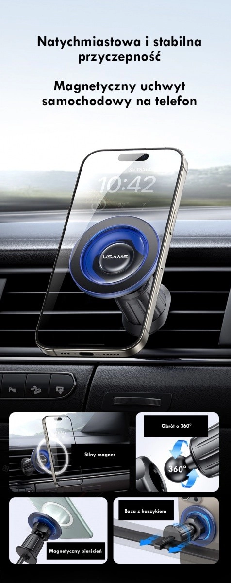 An elegant and practical magnetic car mount USAMS ZJ081 for attachment to the air vent grille offers strong magnetic hold, automatic centering, and a 360° swivel joint for the ideal viewing angle. Thanks to its compact design and quick, tool-free installation, it securely holds your smartphone even in a case, including on bumpy roads.