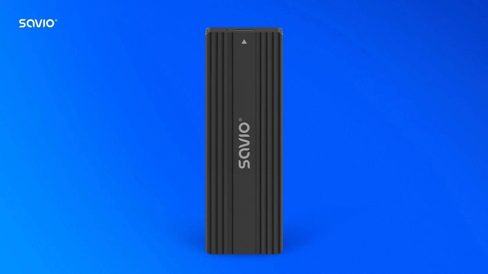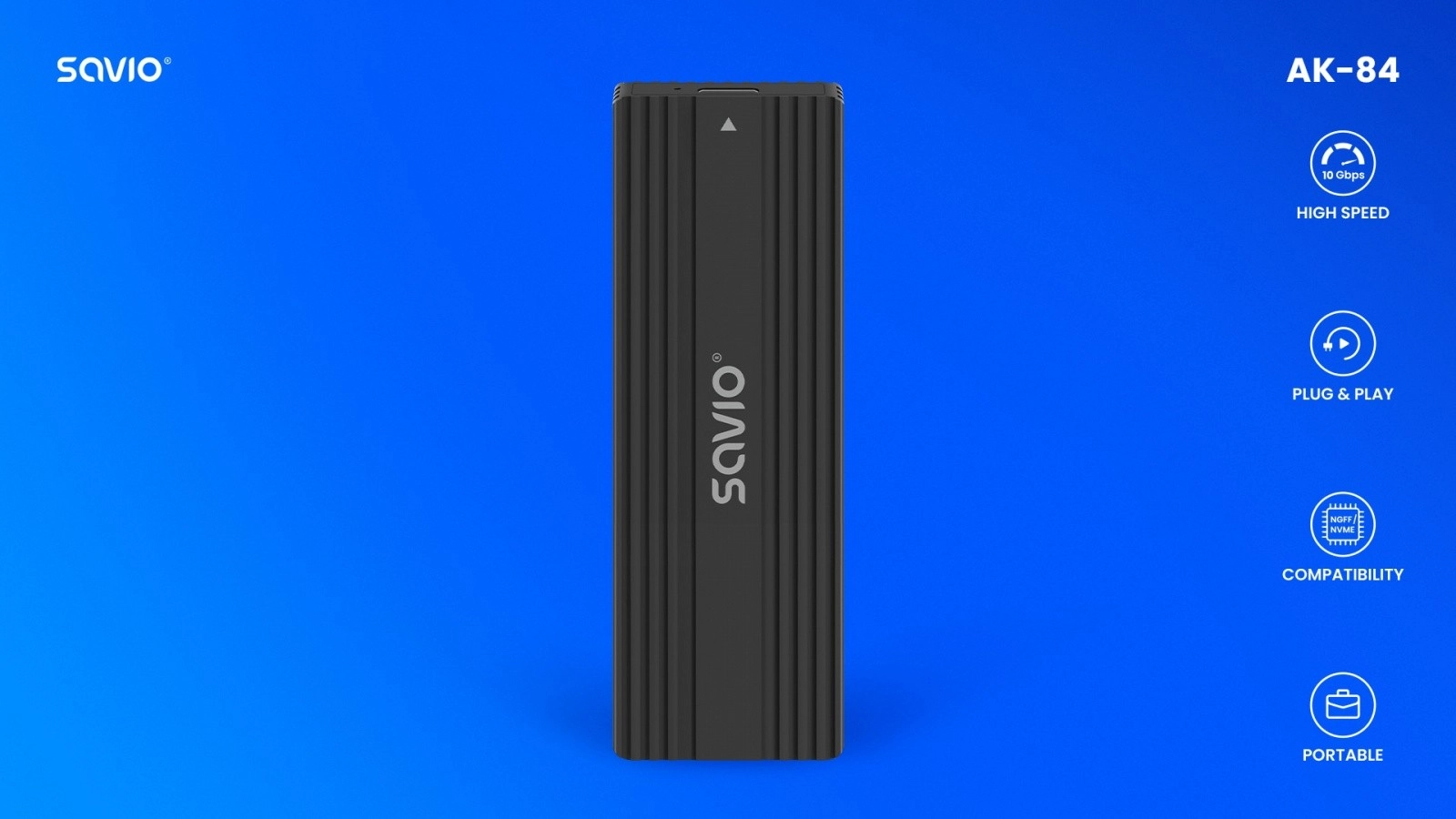 The sleek and durable SAVIO AK‑184 enclosure instantly turns your M.2 SSD (NVMe or SATA/NGFF) into a high‑performance portable drive. Thanks to USB 3.1 Gen 2 it reaches speeds up to 10 Gbps, so large files, backups, and games transfer in moments. Its compact size and weight of just 44 g make it an ideal travel companion.
