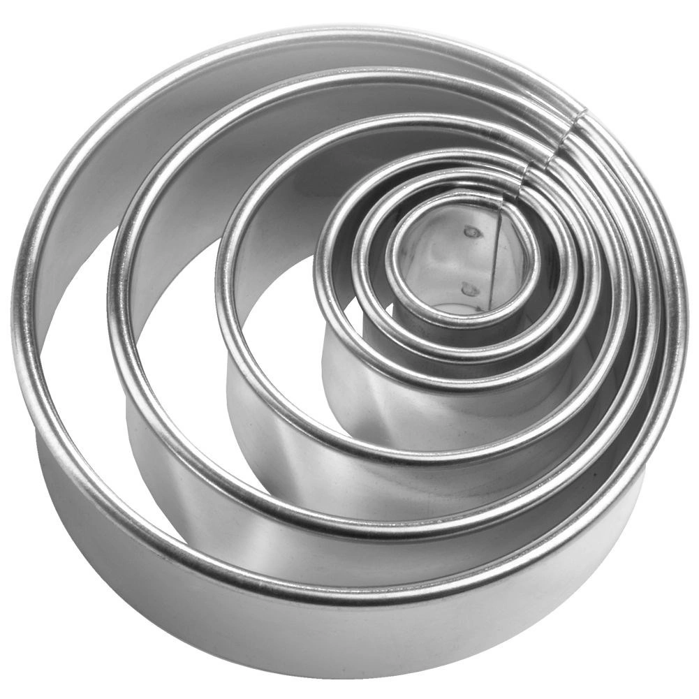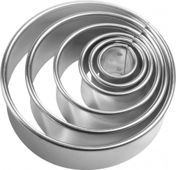 A practical set of five round cutters made of high-quality stainless steel for easy preparation of cookies and gingerbread. Cutters with diameters from 1.3 cm to 5.2 cm are durable, versatile, and dishwasher safe.