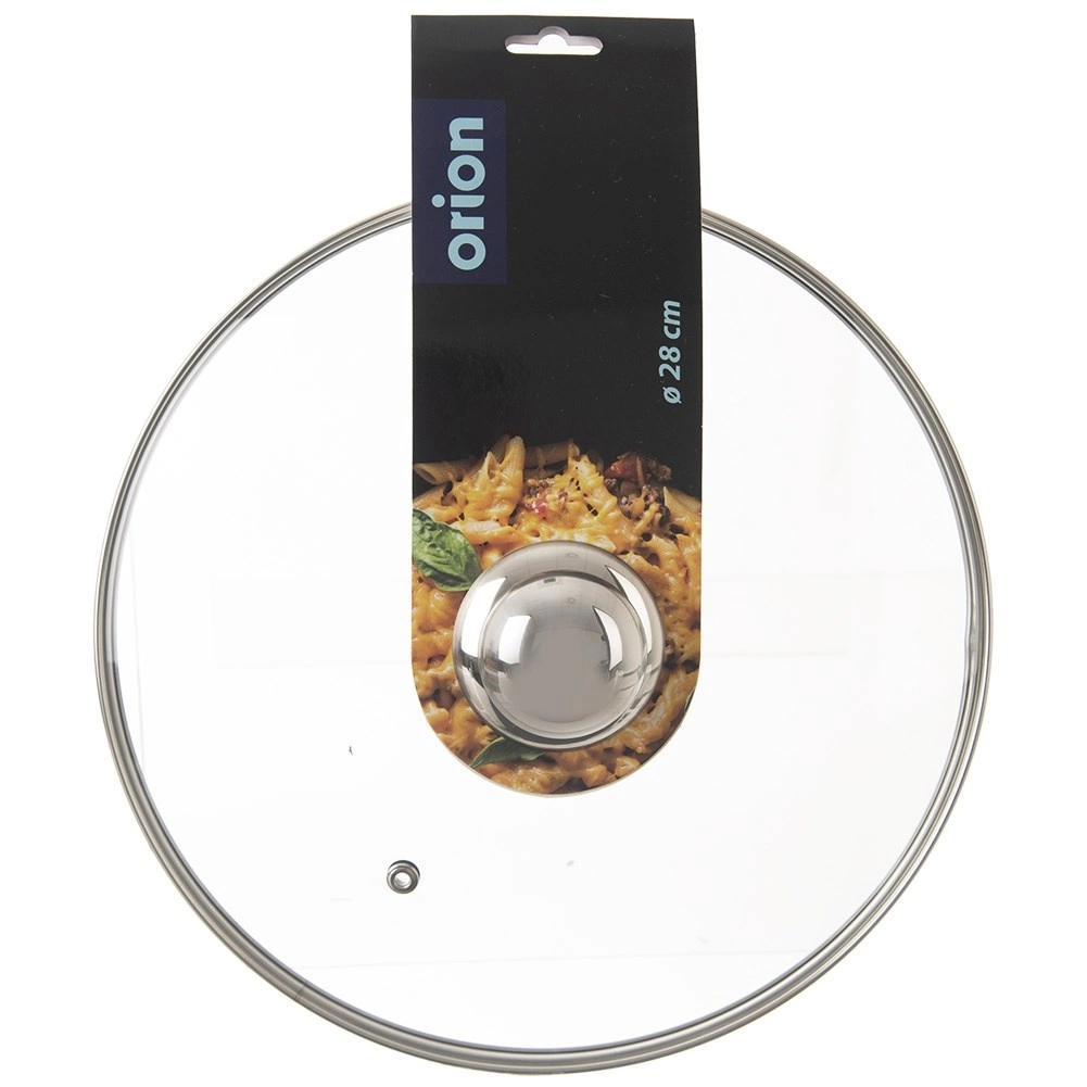 Universal 28 cm glass lid with a sturdy stainless steel rim, comfortable metal handle, and steam vent. Heat-resistant glass lets you monitor cooking without lifting the lid, the slightly domed shape supports hot air circulation, and the tight fit reduces steam loss and splatter. Suitable for pots, pans, and saucepans.