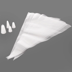A practical set for decorating and filling pastries includes 8 disposable piping bags with a length of 35 cm and 4 reusable plastic nozzles. Ideal for decorating cakes, muffins, pastries and for filling donuts or decorating savory dishes. Durable materials, easy to use, and dishwasher-safe ensure convenient and hygienic use at home and in professional kitchens.