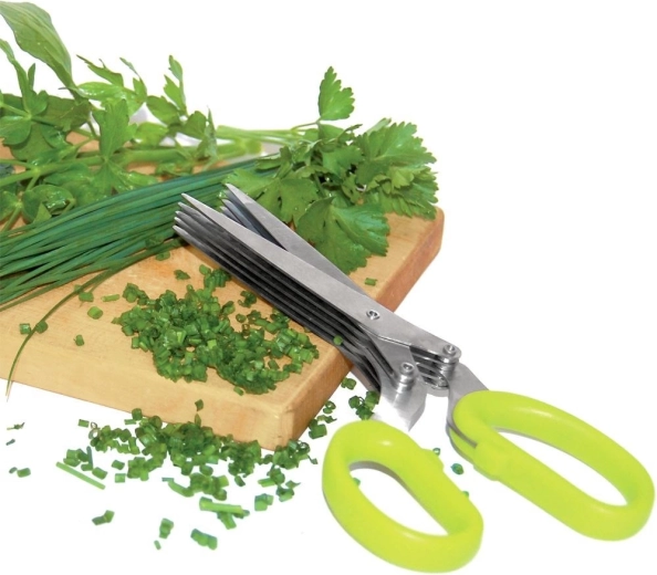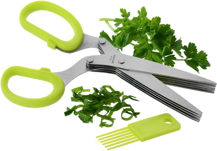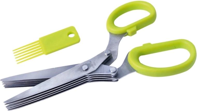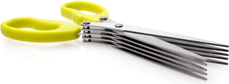 Practical kitchen herb scissors with five parallel blades for fast and even cutting. Durable stainless steel, ergonomic handles, and a cleaning comb included for easy maintenance.