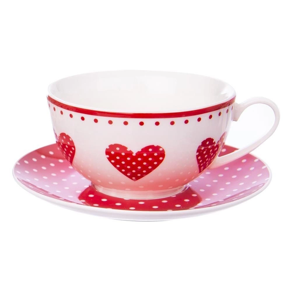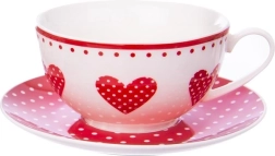 - Romantic design: white porcelain with red polka dots and hearts for a cozy atmosphere.