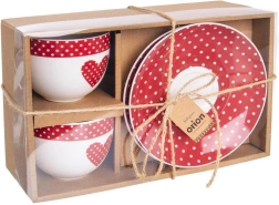 An elegant set of two porcelain cups with saucers in a gift box. Each cup has a capacity of 280 ml and a comfortable handle. The snow-white and red color with a white polka dot motif gives the set a stylish look. Thanks to quality porcelain craftsmanship, the cups are durable, dishwasher-safe and microwave-safe, and perfect for coffee or tea.
