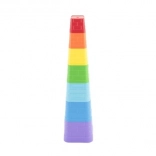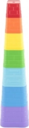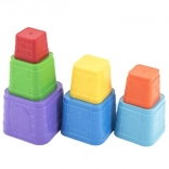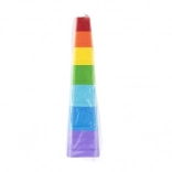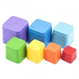 Seven square cubes in vibrant colors stack easily into a stable tower and support coordination and patience.