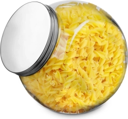 Practical 3 L glass jar with a wide mouth and a stainless steel screw-on lid for airtight food storage. The durable clear glass lets you check contents at a glance, with versatile use from pasta and cookies to spices or pet food. Thanks to two storage orientations and flat sides, it saves space and looks great on the counter or shelf.