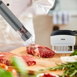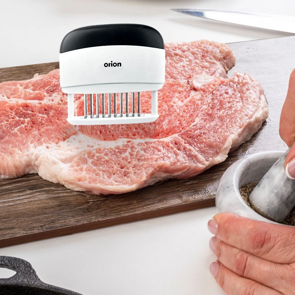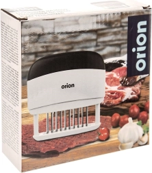 A practical ORION meat tenderizer and injector with 20 stainless steel needles ensures quick tenderizing and even marinating. Thanks to the ergonomic handle, it is comfortable to use, durable, sharp, and safe thanks to the protective cover. Ideal for grilling and pan-frying juicy steaks and cutlets.