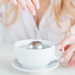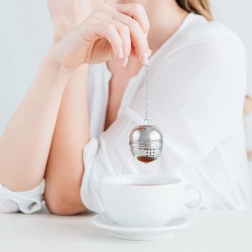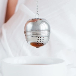 The infuser has a compact spherical shape and a secure snap closure to prevent accidental opening. The chain with hook makes it easy to handle and hang on a mug, glass, or teapot. You can also use it for cooking—hold herbs and spices for soups or stocks.