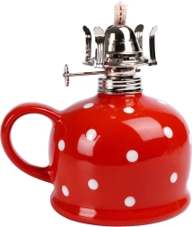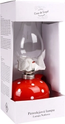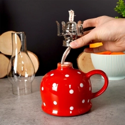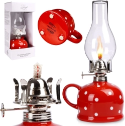 A stylish ceramic oil lamp in a retro design with a capacity of 530 ml and a height of 28.5 cm provides pleasant ambient light at home, at the cottage, or during a power outage. It has a durable glass chimney, a metal burner with wick adjustment, and a practical handle for carrying. The red body with white polka dots adds vintage charm and a romantic atmosphere to your interior.