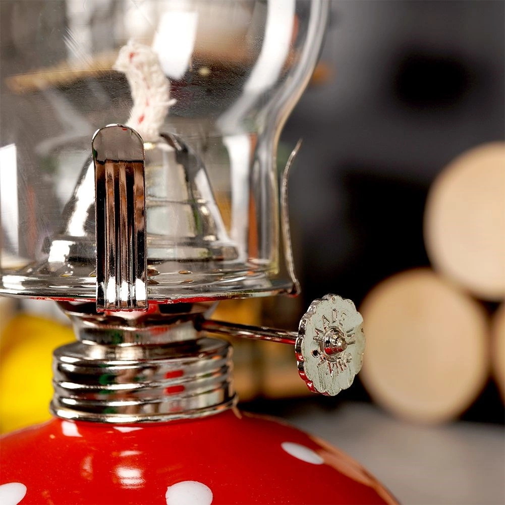 This traditional kerosene/oil lamp in an elegant retro style combines decorative appeal with reliable, electricity-free lighting. The glass chimney effectively shields the flame and lets through ample light, while the ceramic red tank with white polka dots is a striking design element.