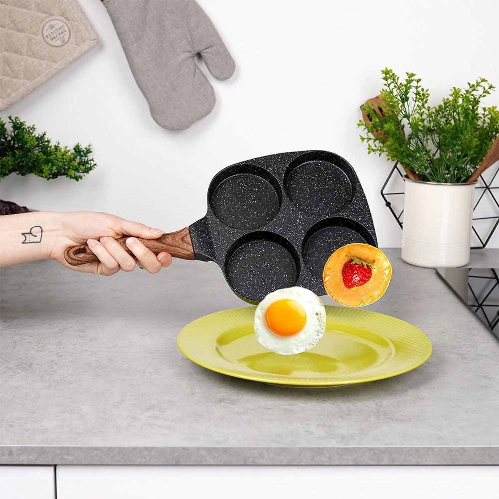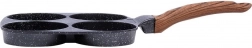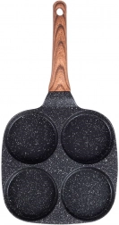 Practical pan with four round molds, each 8.5 cm in diameter, for perfectly shaped eggs, fritters, and mini pancakes. A durable aluminum body with a non-stick granite surface in black enables cooking with minimal fat, distributes heat evenly, and saves time and energy. The ergonomic handle with a wood-look finish is comfortable, non-slip, and has a hanging hole. The pan is suitable for gas, electric, ceramic, halogen, and induction and is easy to clean, including in the dishwasher.
