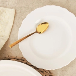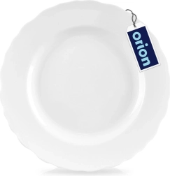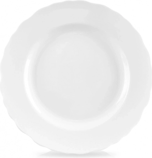 An elegant porcelain dessert plate with a diameter of 19.5 cm and a wavy rim, ideal for serving cakes, desserts, and snacks. Made from quality white porcelain, it is dishwasher safe and microwave safe, and thanks to its classic design it pairs beautifully with any table setting.