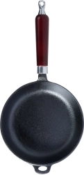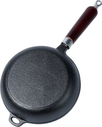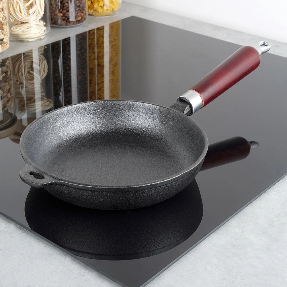 Universal cast-iron frying pan 20 cm for frying, baking, and braising on all types of cookers including induction, on the grill, and directly over an open flame. The heavy cast iron excellently retains heat, ensures even cooking, and keeps dishes warm for a long time. Ergonomic wooden handle and helper handle for safe handling, with the option to hang. No chemical surface coatings, exceptionally durable and long-lasting with proper care.