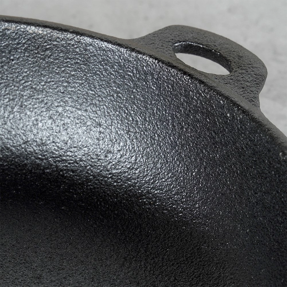 The pan is versatile: it works on gas, electric, ceramic, halogen, and induction hobs, as well as on the grill or over an open flame. It has a long ergonomic wooden handle and a helper handle with a hole for hanging. The construction without non-stick coatings is naturally durable – just regularly oil/season.