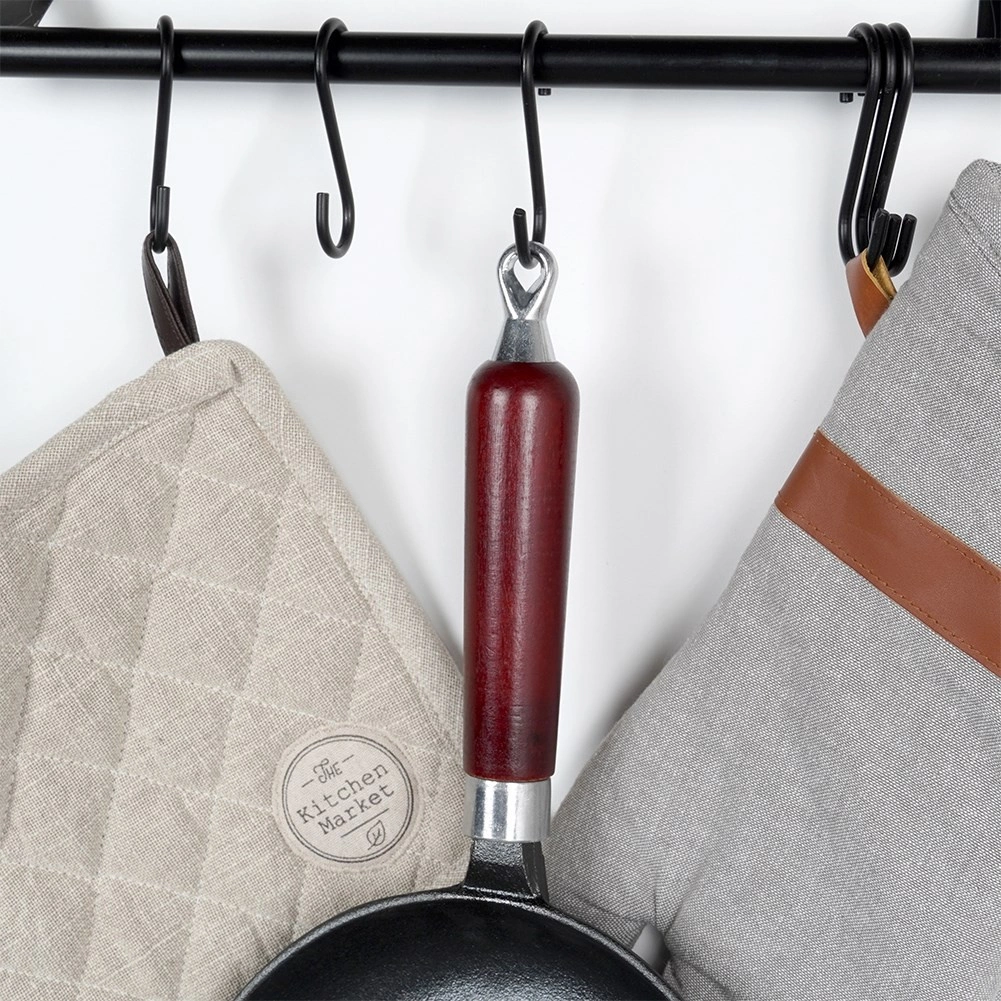 Ergonomic wooden handle and helper handle for a secure grip. The eyelet allows convenient hanging and space saving.