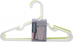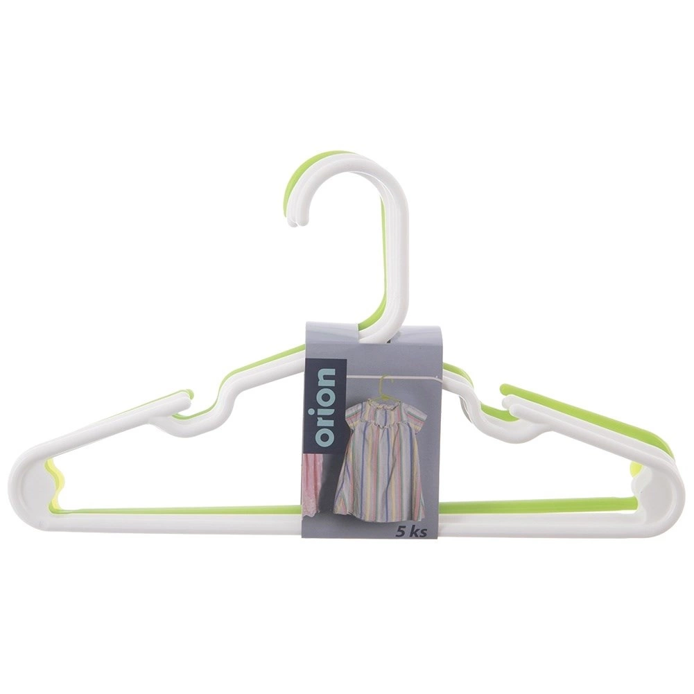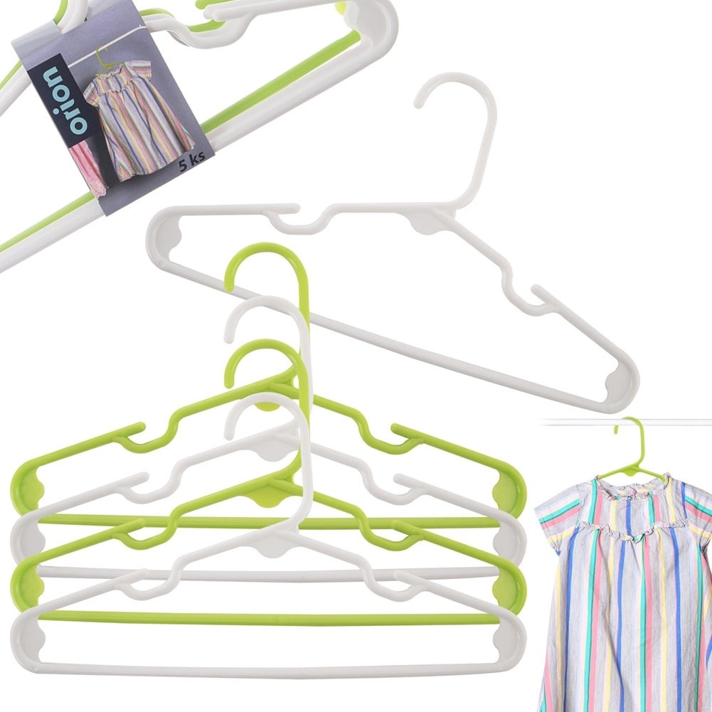 Keep your child's wardrobe perfectly organized with a set of 5 lightweight and durable hangers. They are sized for children's clothes, feature smooth edges, and practical notches on the shoulders. The fresh white and green color combination looks great and fits perfectly in a kids' room. Universal use, a safe shape, and sturdy construction ensure clothes stay neat and free from distortion.