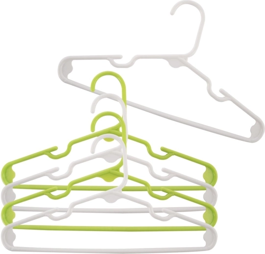 Lightweight plastic in white and green resists deformation, and the hangers can be easily stacked to save space.