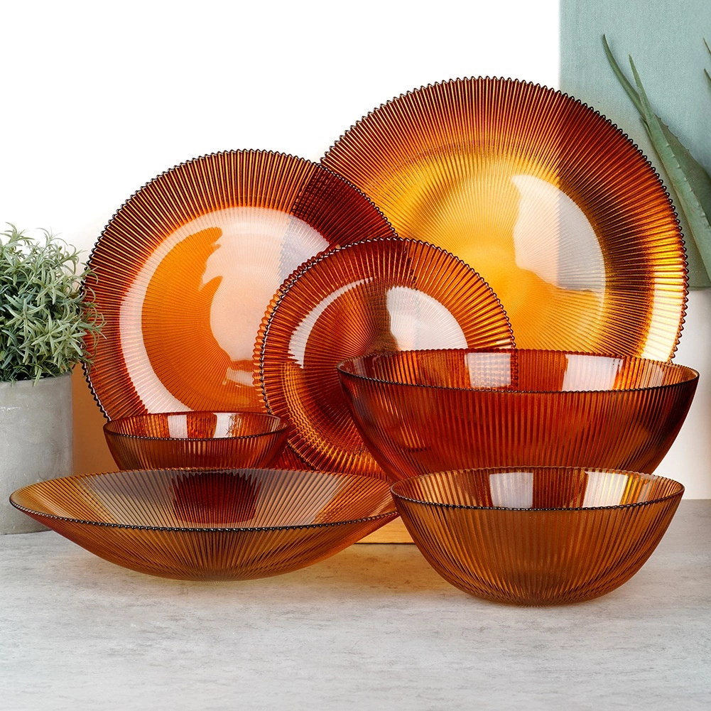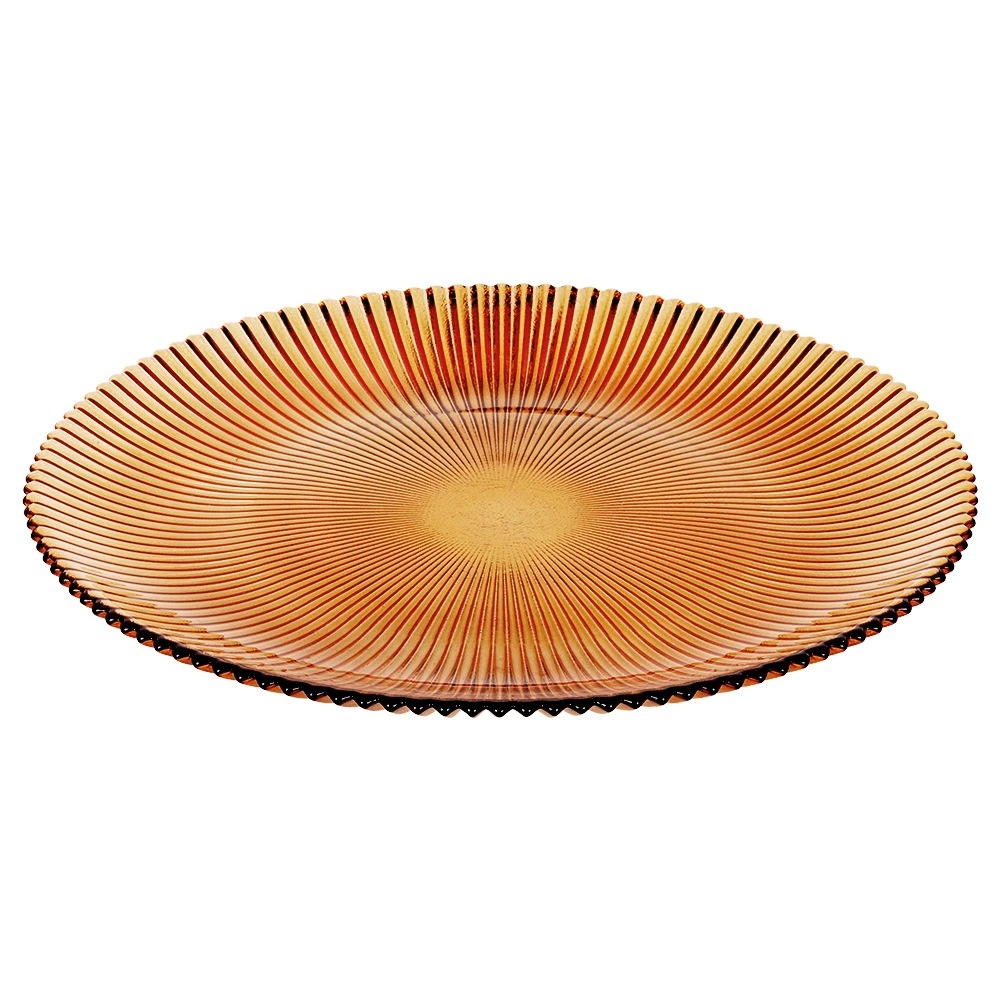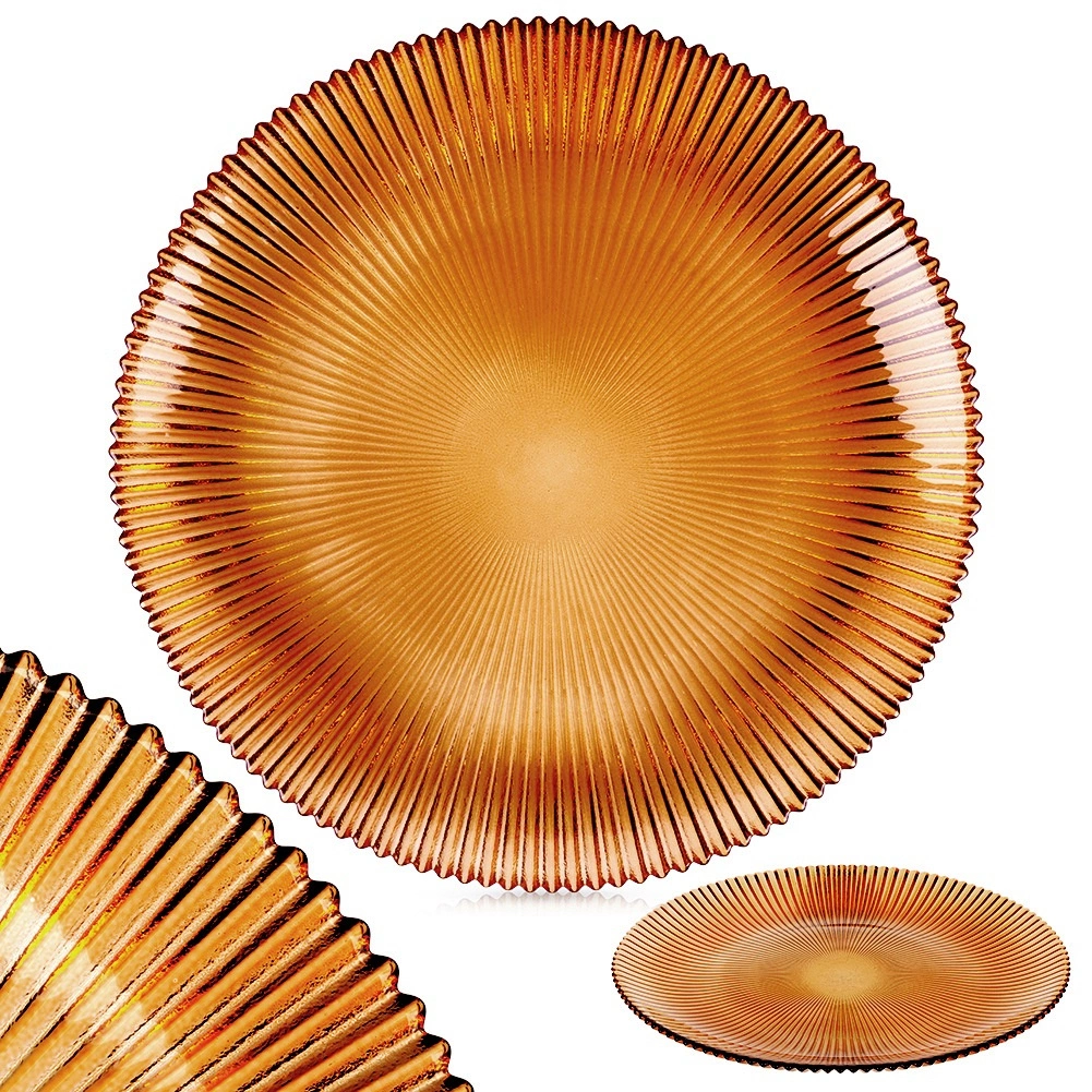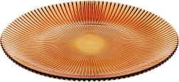 A stylish glass dessert plate with a diameter of 21 cm in a warm amber tone adds an elegant touch to your table setting. Made from durable glass with a pronounced radial texture that enhances both grip and appearance. Ideal for serving desserts, appetizers, or breakfast. Elegant design, amber color, durable glass, and easy care for everyday and festive use alike.