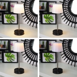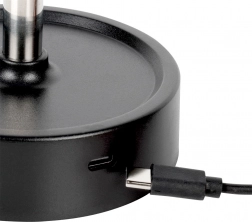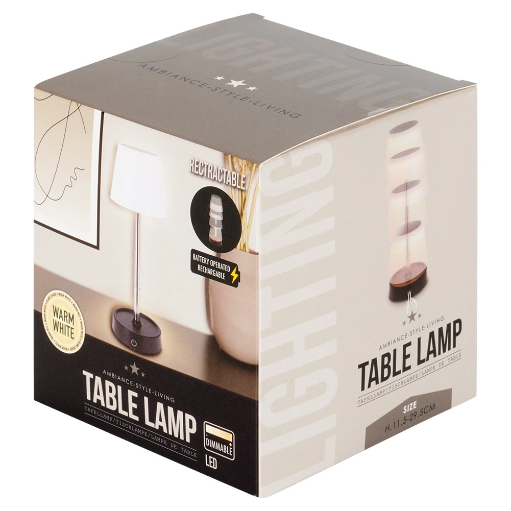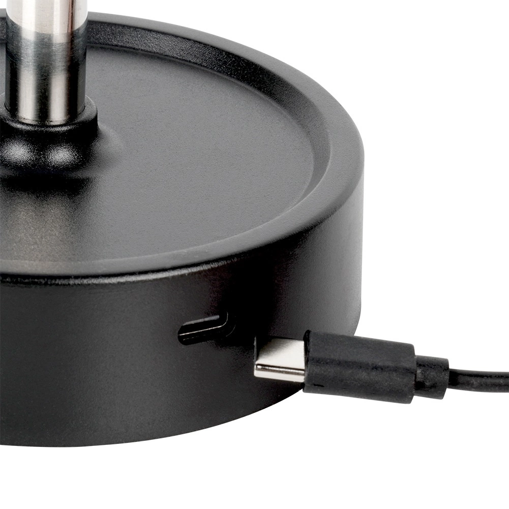 Modern LED desk lamp with adjustable height 11–29.5 cm, touch controls and dimming for comfortable task and ambient lighting. Offers warm white light, USB‑C charging, and an elegant combination of a black base, metal stem, and white shade. Perfect for a desk, bedside table, or living room.