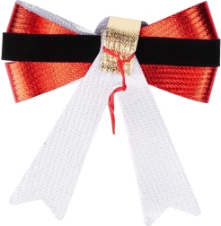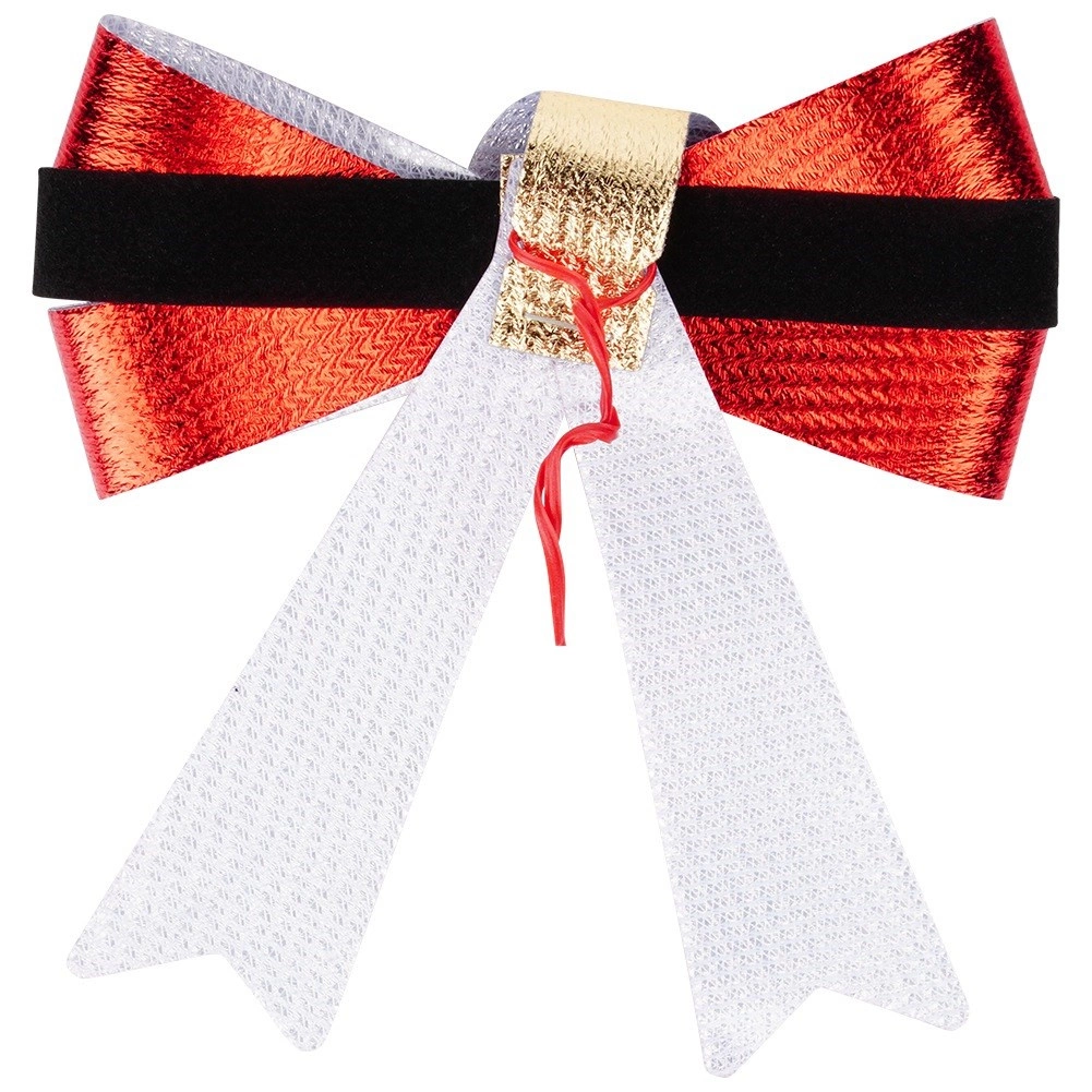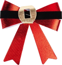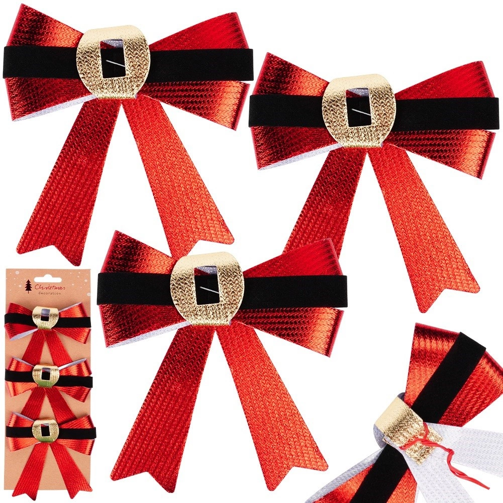 An elegant set of three Christmas bows measuring 10 × 10 cm adds instant shine to your holiday decor. The bows in red metallic finish with a black band and a gold “buckle” evoke a classic Christmas style. They are lightweight, easy to attach with wire, and suitable for trees, wreaths, railings, and windows. Thanks to the quality material, they are durable, reusable, and create a festive atmosphere in any interior.