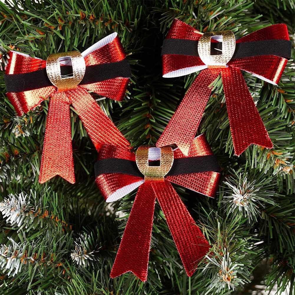 Red satin loops with a black band and a gold “buckle” detail create a Santa belt effect—a stylish accent for the tree and your interior.