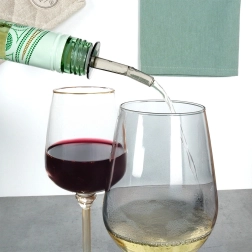 The ribbed, conical stopper made from flexible material adapts to different neck diameters and stays secure while pouring and removing.