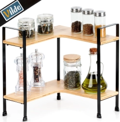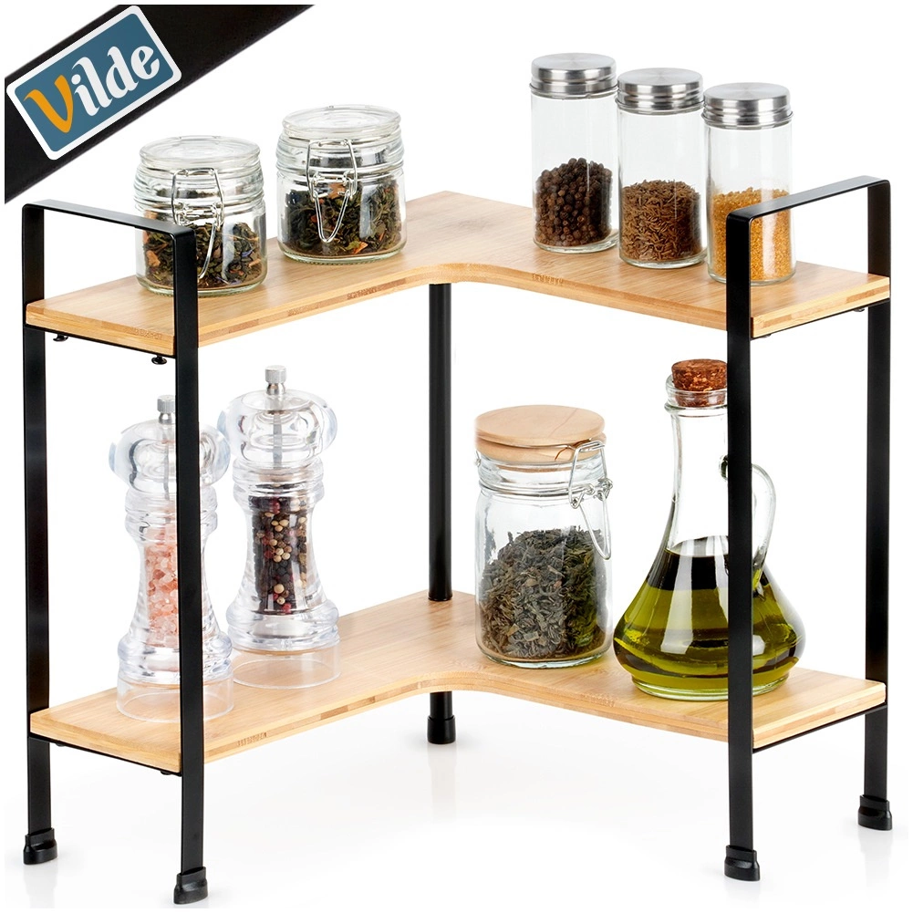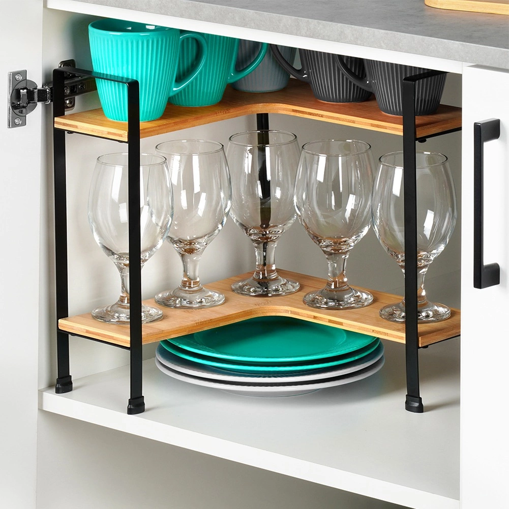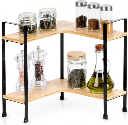 This elegant and practical corner shelf helps you maximize space on the kitchen counter and inside cabinets. The L-shaped frame sits neatly in the corner, while two tiers allow clear storage of spices, jars, and small accessories. The combination of natural bamboo and black metal brings a modern look to your kitchen.