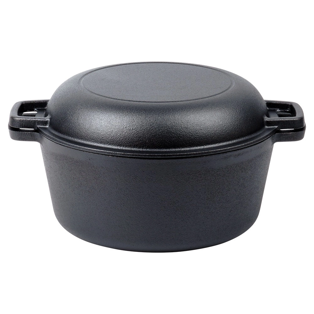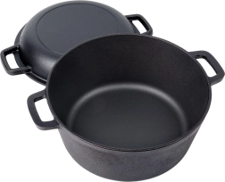 Cast-iron pot with a 4.5 l capacity and a practical lid (1.6 l) that you can also use as a shallow pan or small roaster. All-cast-iron build excels at conducting and retaining heat, ensuring dishes are juicy, evenly cooked, and stay warm longer when served.
