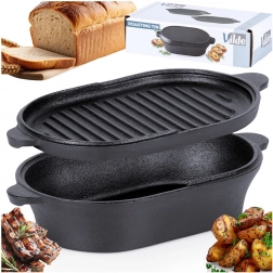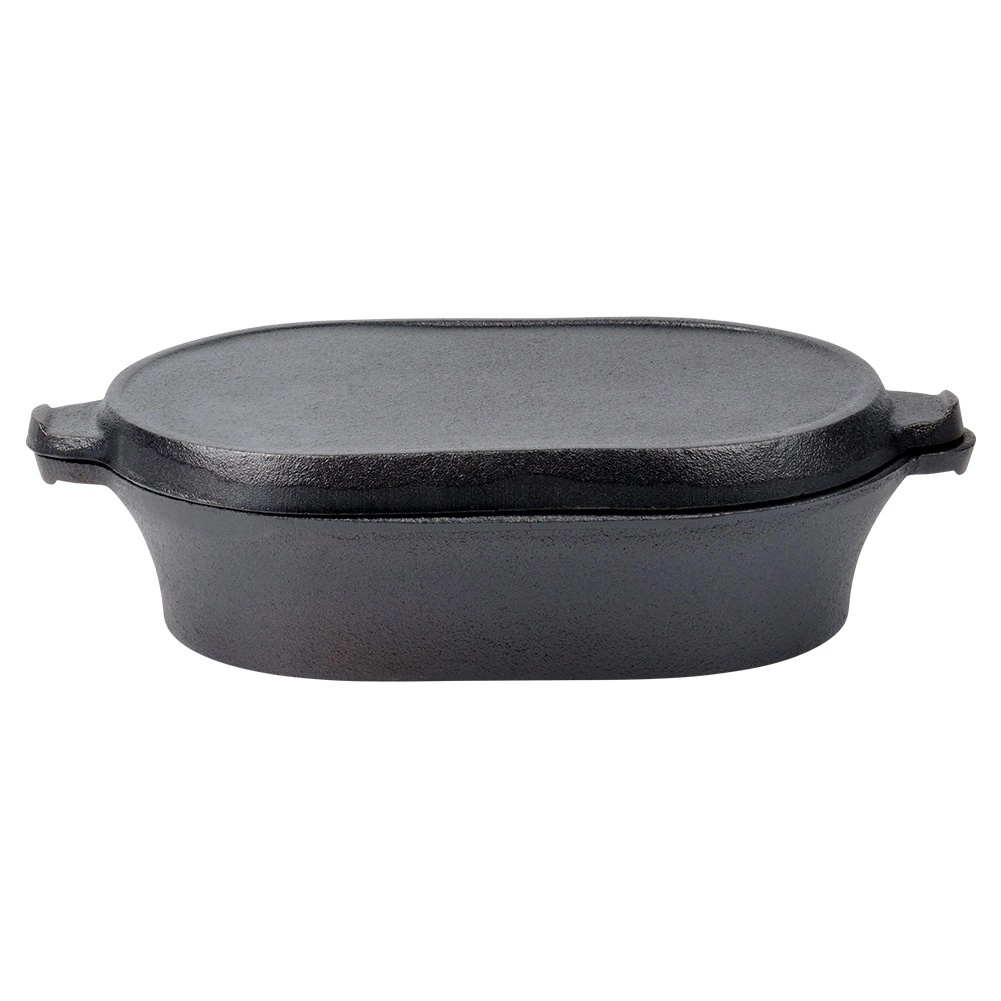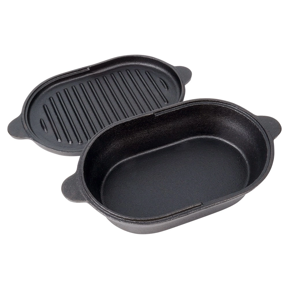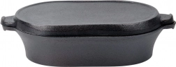 This oval cast iron roaster with a practical 2-in-1 lid is designed for everyday and festive cooking alike. The bottom part serves as a deeper roasting dish for meat, potatoes, or vegetables, while the lid with a ridged base functions as a standalone grill pan for perfect searing and grill marks.