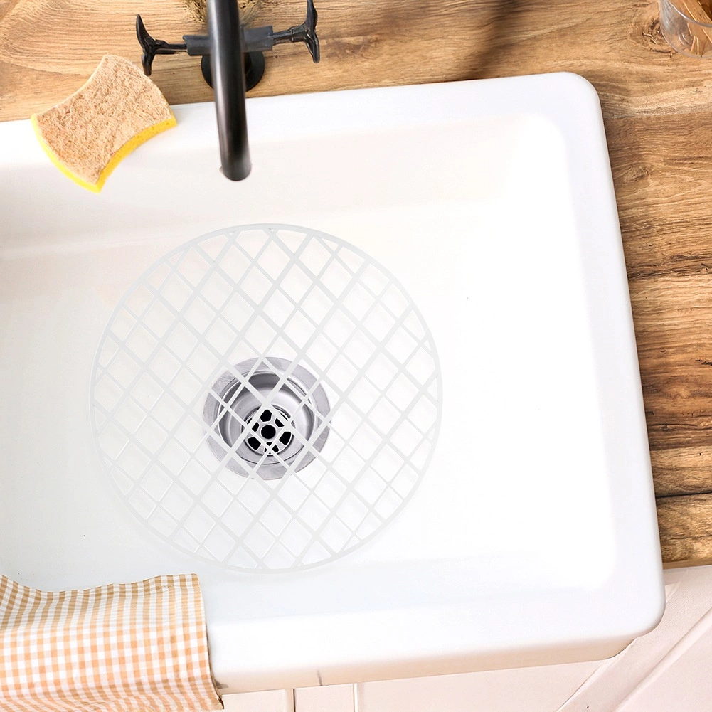 A practical round sink mat with a diameter of 32.5 cm protects the bottom of the sink from scratches and impacts. It is made of durable plastic, has a non-slip surface, perforation for free water drainage, and withstands temperatures up to 80 °C. The universal white color suits most kitchens.